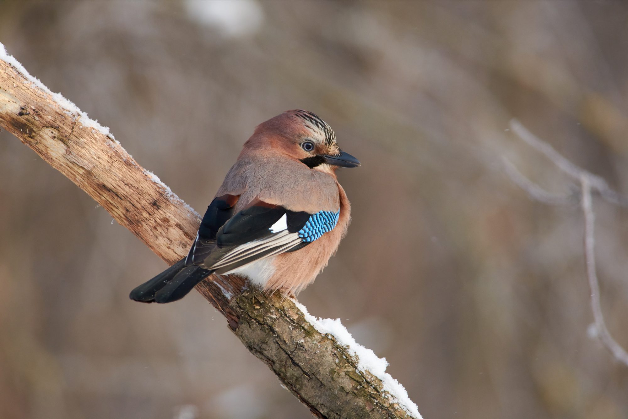eurasian jay sits on an oak branch covered with snow in a forest park on the first day of winter.